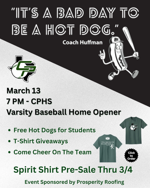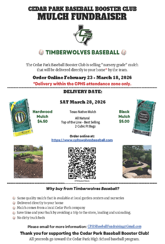 Mar 10 (Tue) - District Games Begin Mar 13 (Fri) - Bad Night to be a Hotdog, Great Day to be a Timberwolf (Free hotdogs for students & teachers) Mar 24 (Tue) - Staff Appreciation Night *Mar 28 (Sat) - Mulch Delivery Day April 2 (Thu) - Military / First Responders Appreciation Night |